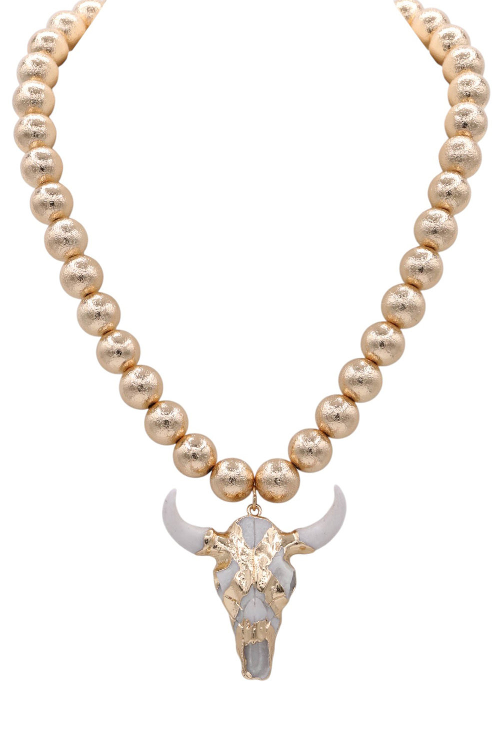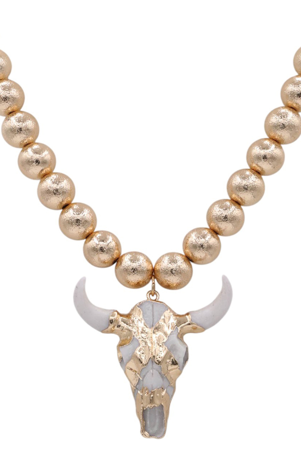 - Chic and bold, this metal necklace showcases a bull skull pendant with decorative beads. Ideal for layering or wearing as a statement piece.