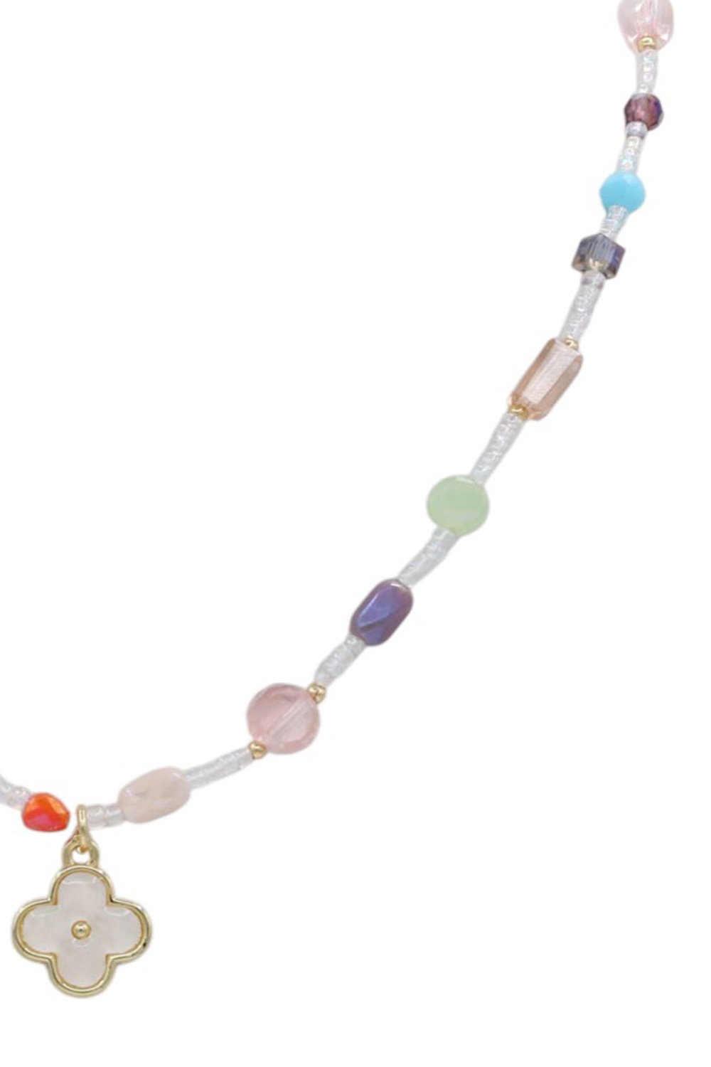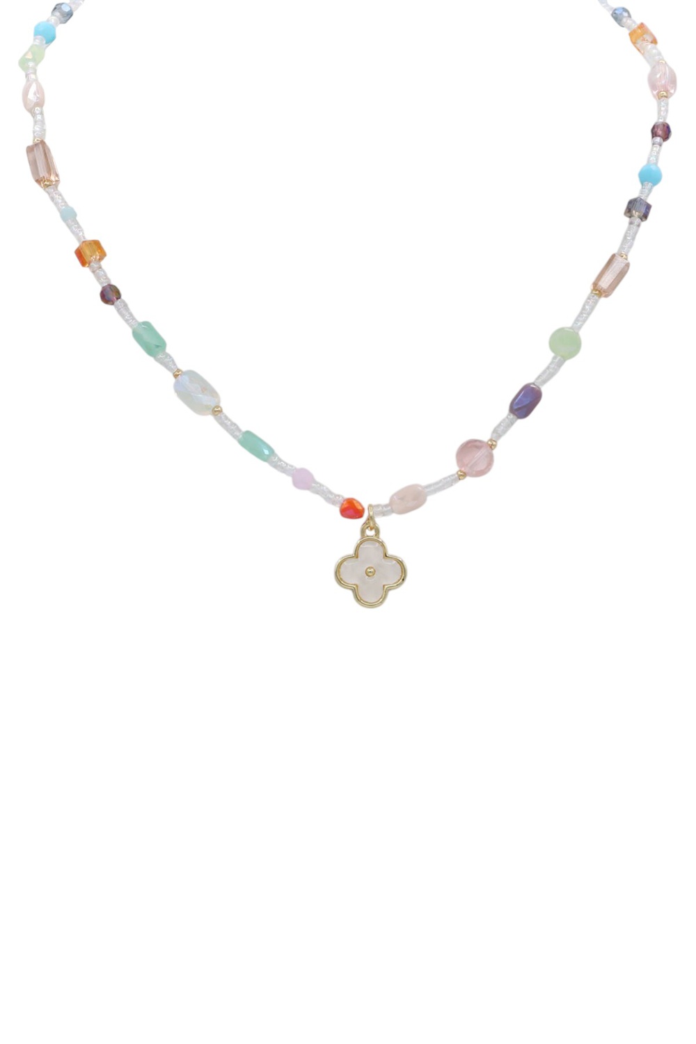 - Chic and feminine, this glass beaded necklace is finished with a charming clover pendant for a soft, romantic look. Perfect for layering or wearing solo.