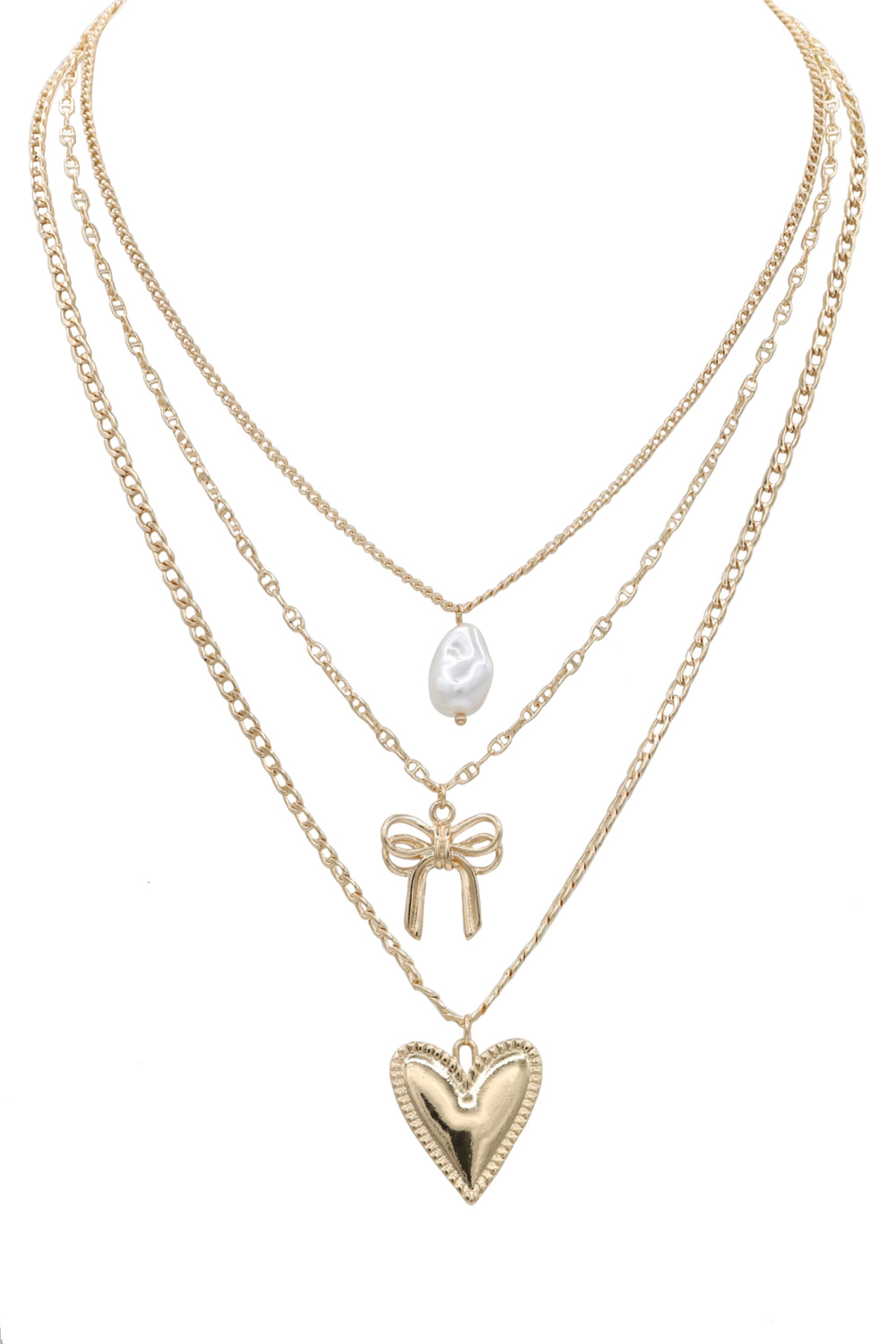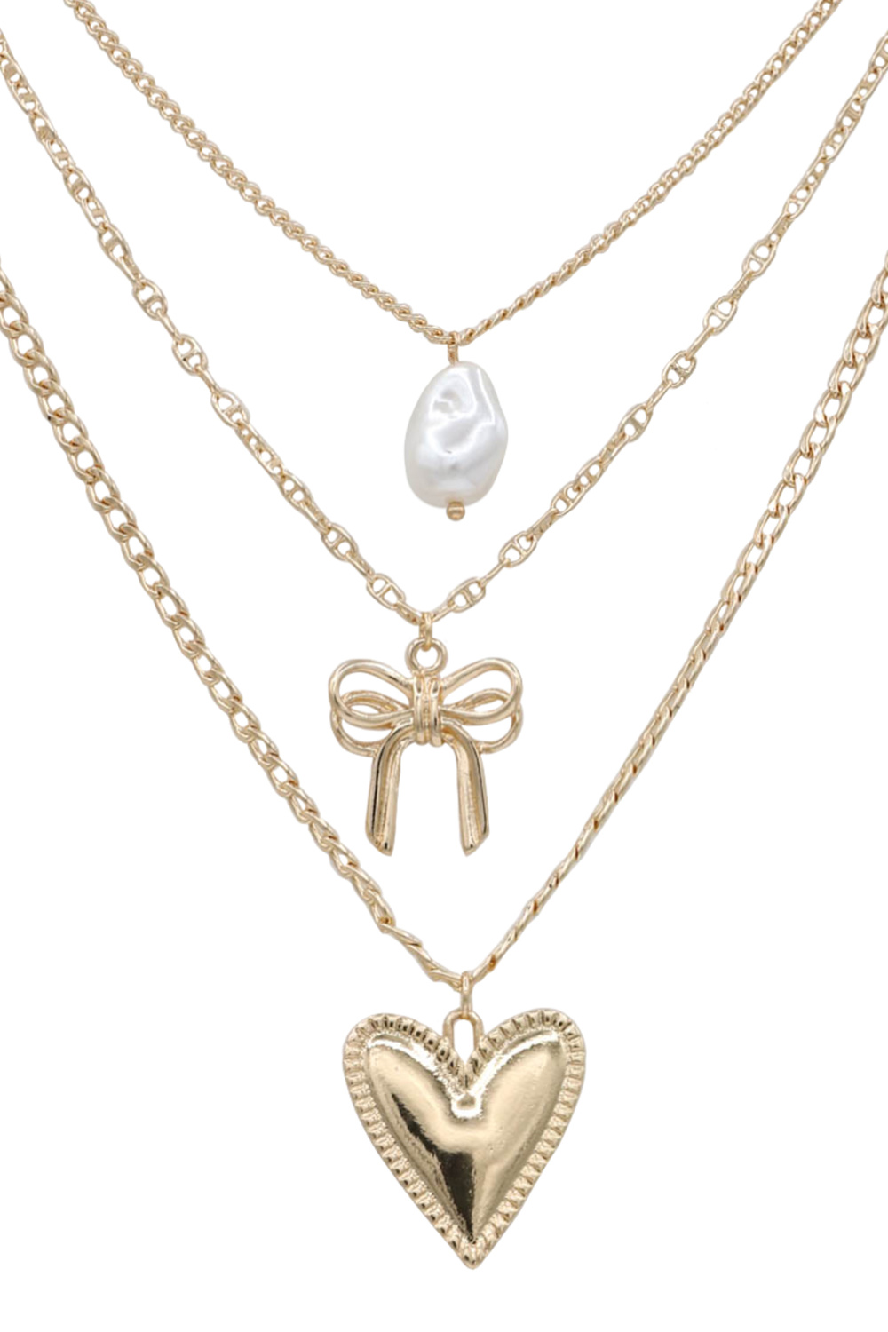 - Layered metal necklace featuring pearl accents along with bow tie and heart charms. Feminine, lightweight, and versatile.