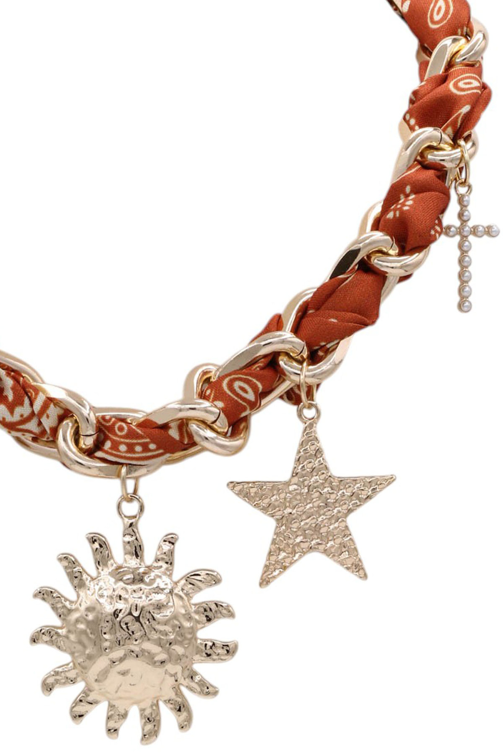 - Chic and symbolic, this fabric chain necklace showcases a mix of sun, star, and cross charms for a layered, celestial-inspired look. Perfect for adding meaning and style to any outfit.