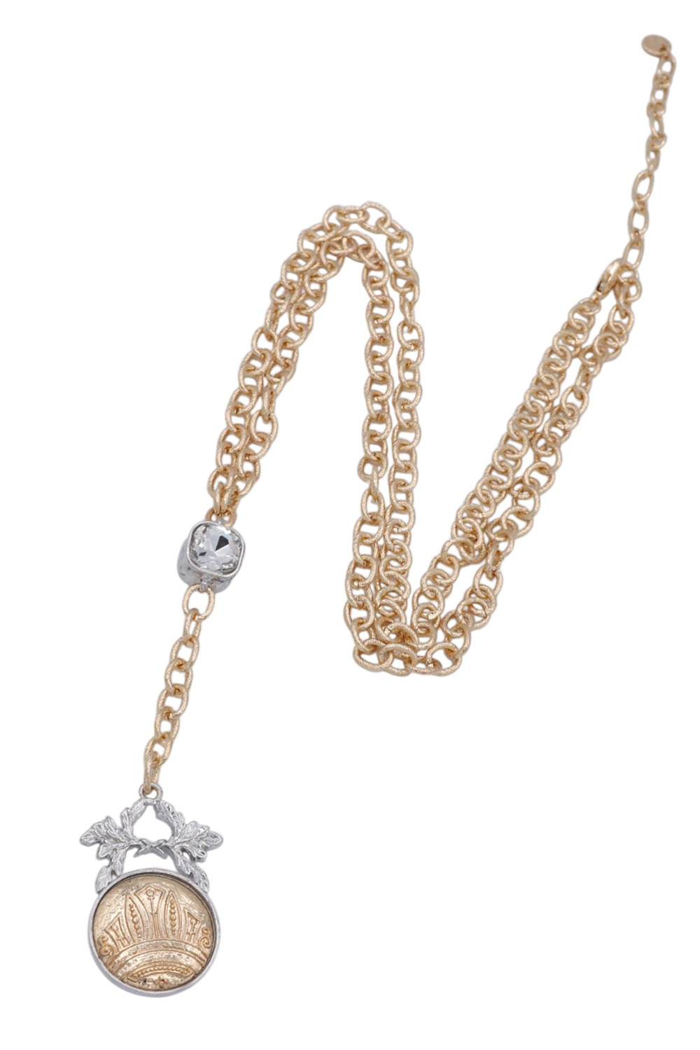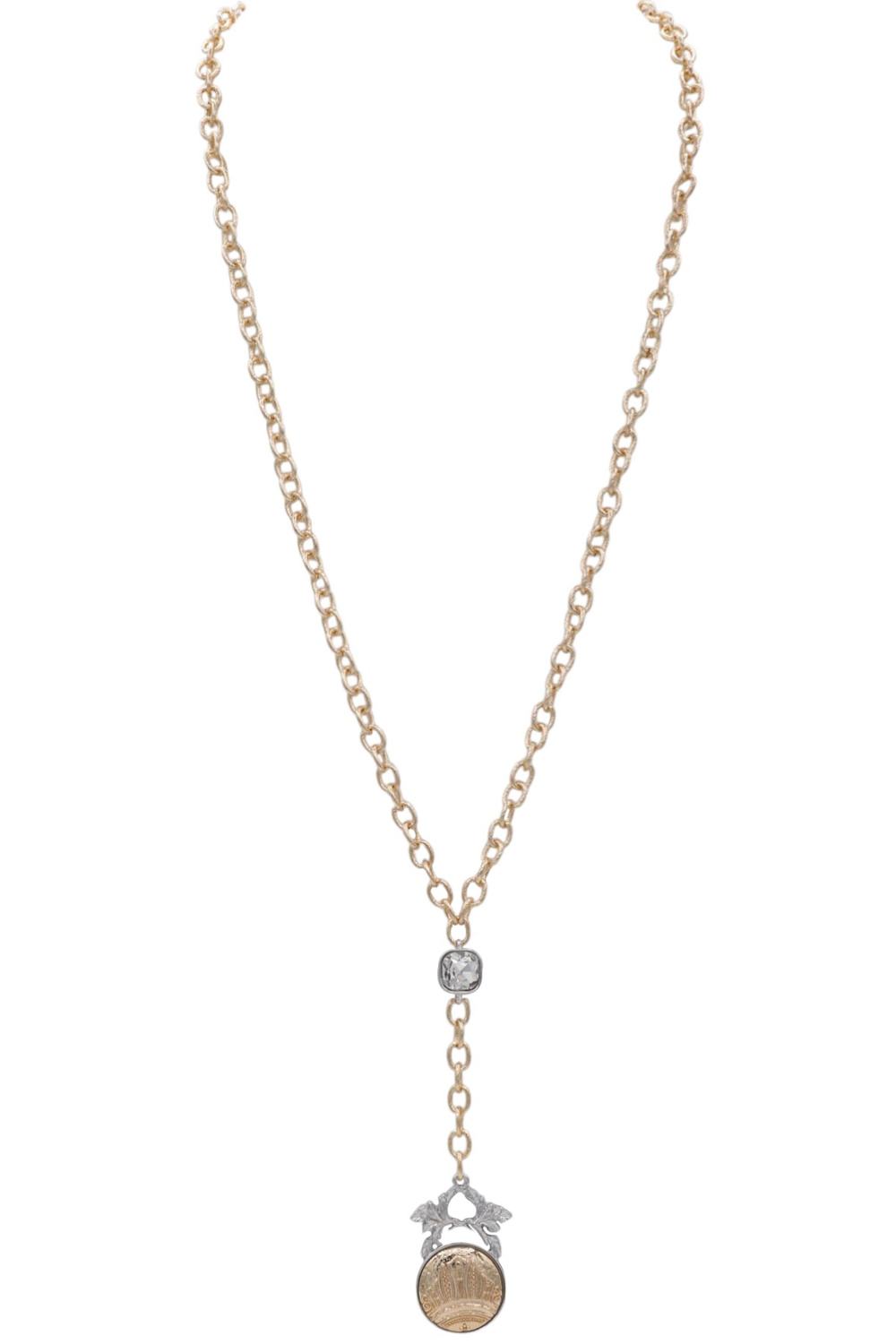 - A stylish long Y-lariat necklace featuring a textured chain accented with a sparkling jewel and pendant drop. Elegant and modern, this piece adds length and shine to any outfit.