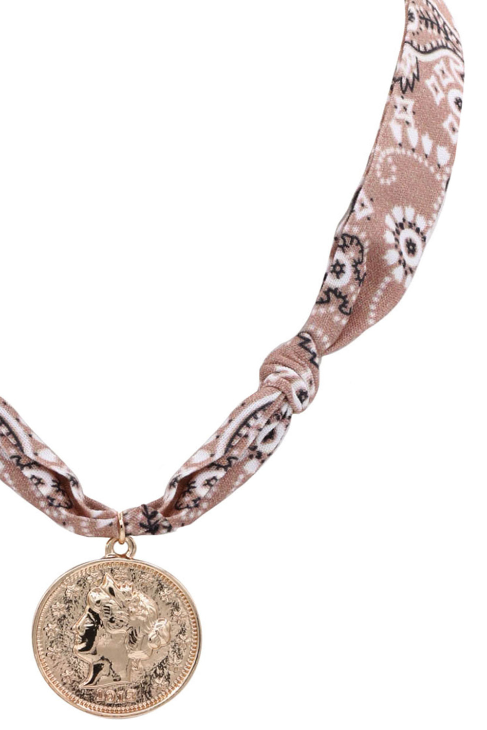 - Trendy bandana necklace showcasing a detailed western coin pendant. A bold accessory that captures timeless country style.