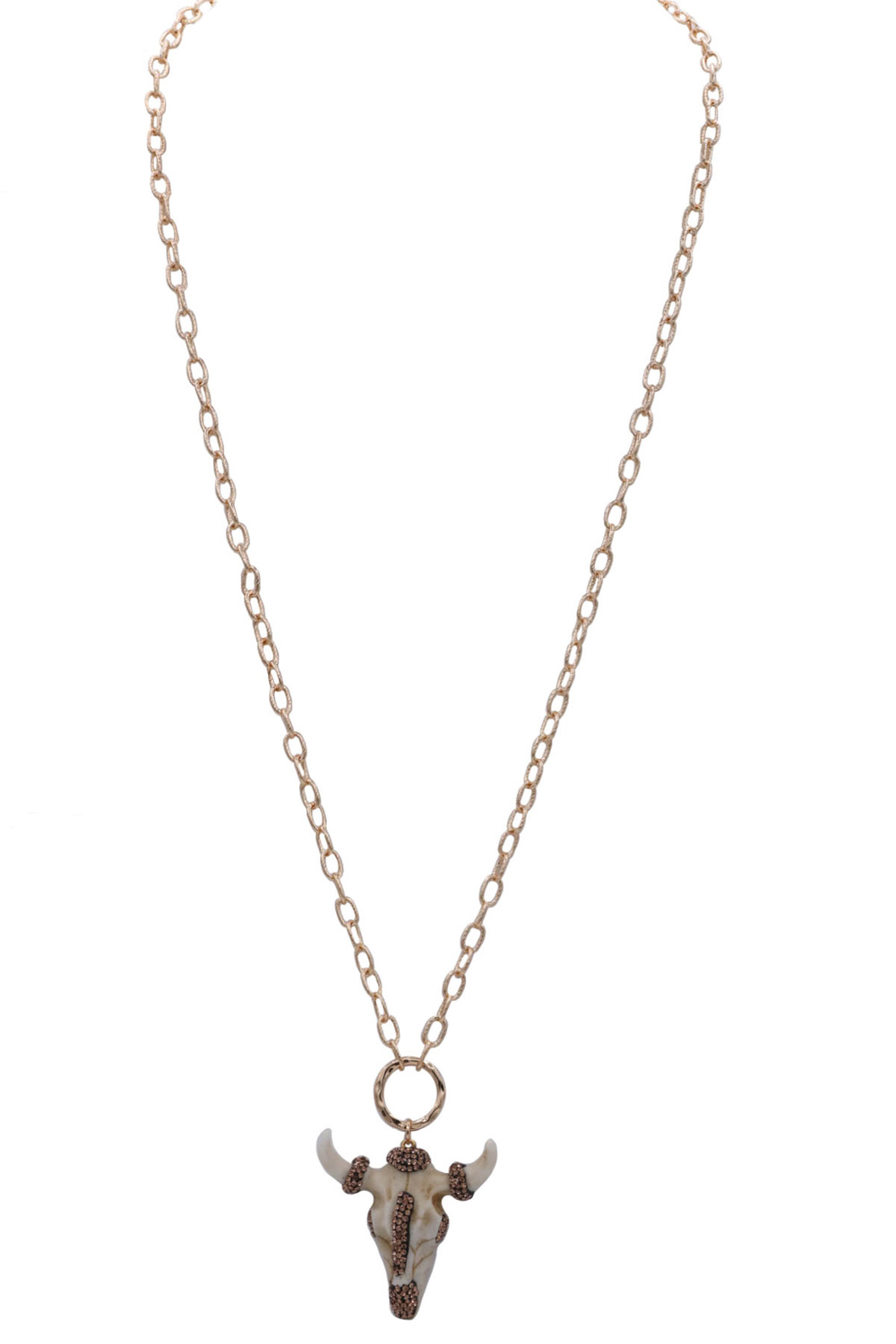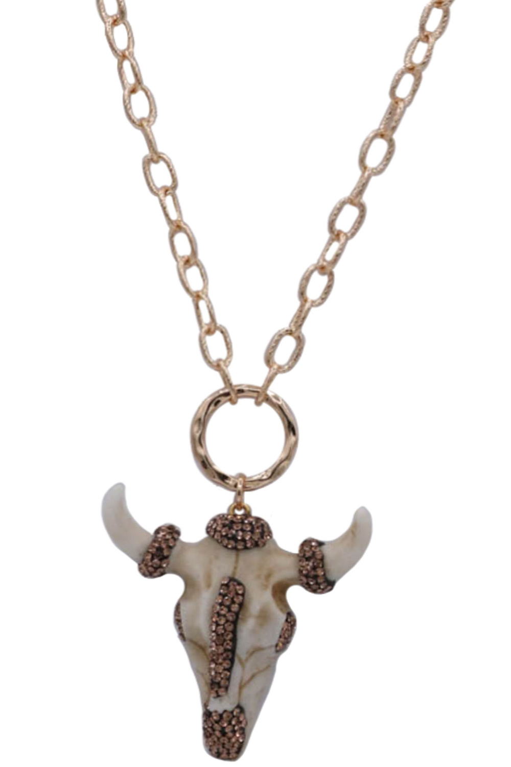- A bold western pendant necklace featuring a detailed metal bull skull accented with sparkling rhinestones - the perfect cowgirl statement piece.