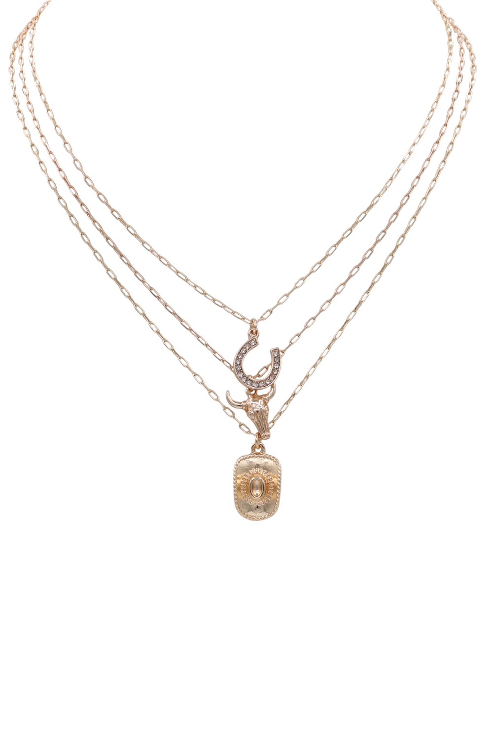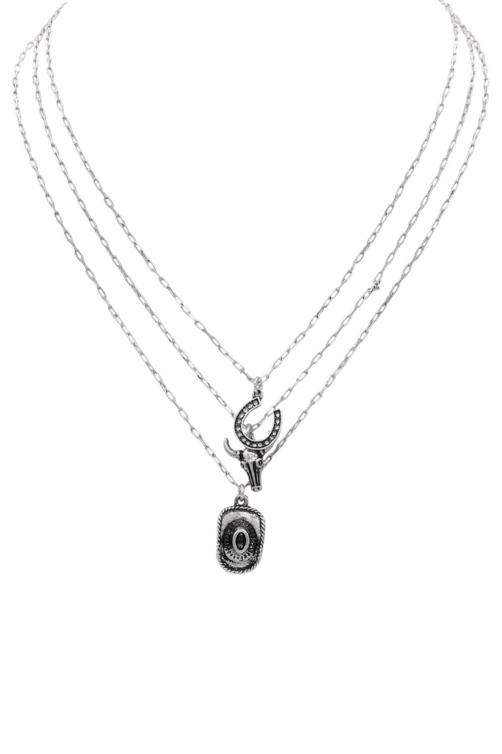 - Chic layered necklace adorned with assorted western charms. A versatile piece that blends rugged charm with feminine flair.
