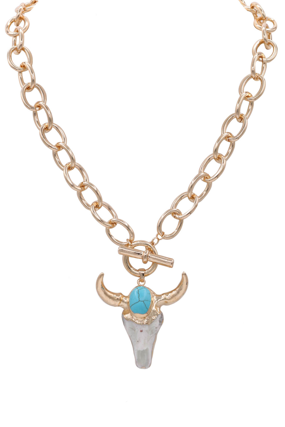 - Striking metal chain necklace featuring a bull skull pendant and toggle clasp. Perfect for layering or wearing solo for bold, western flair.