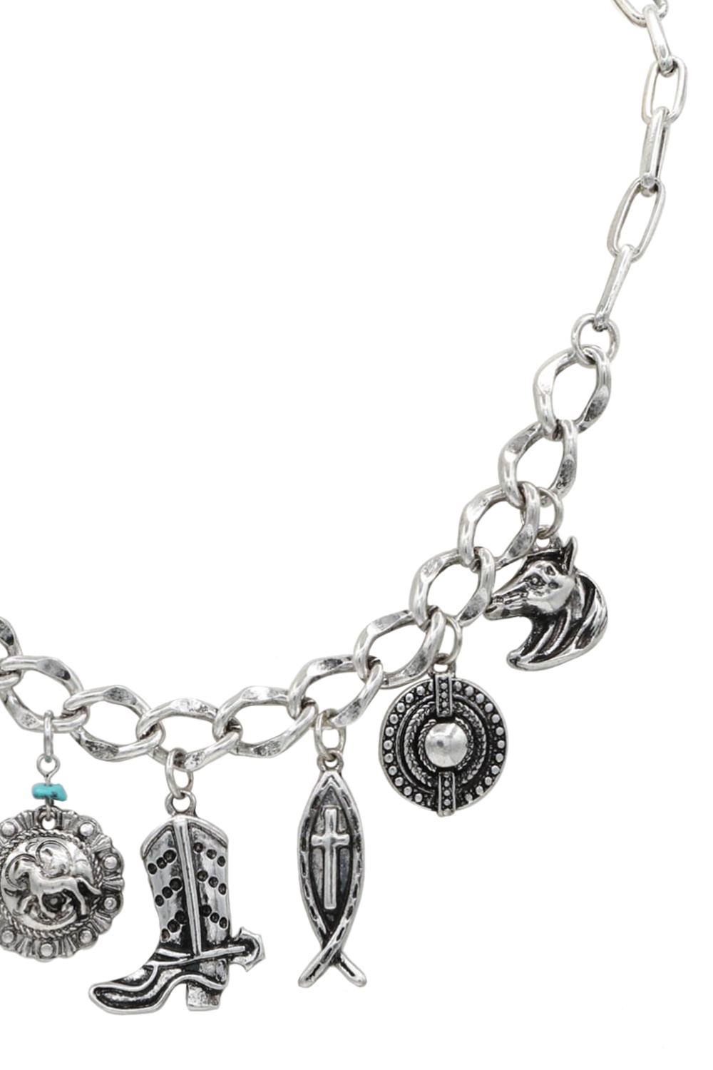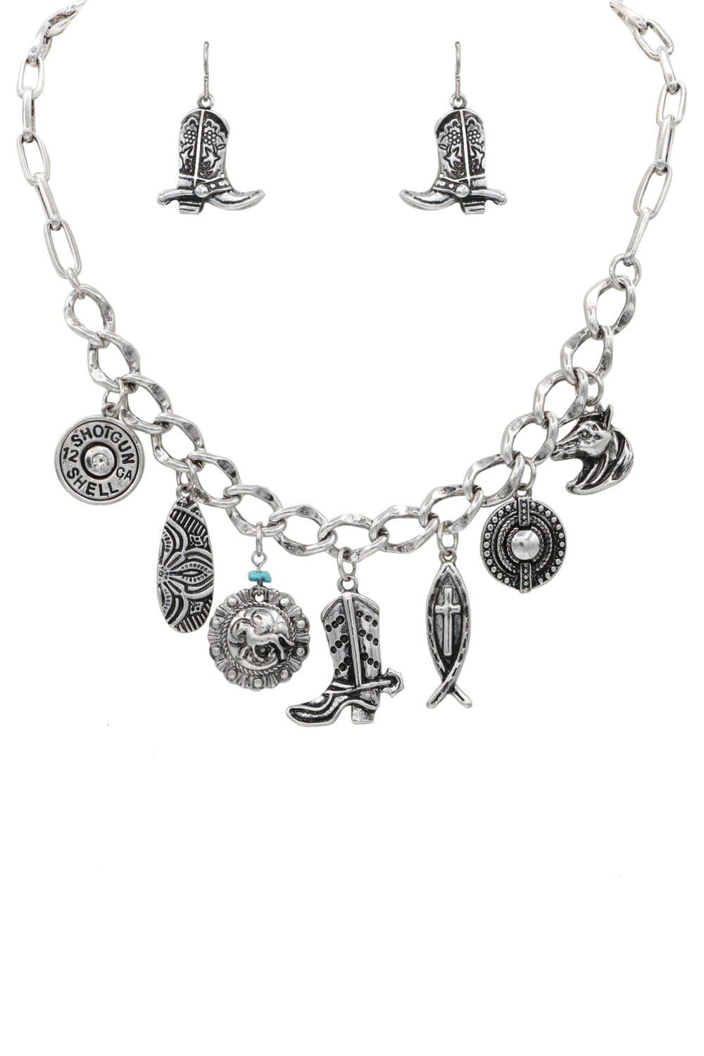 - Chic and bold, this western-inspired set includes a charm necklace and coordinating earrings for a cohesive, statement look.
