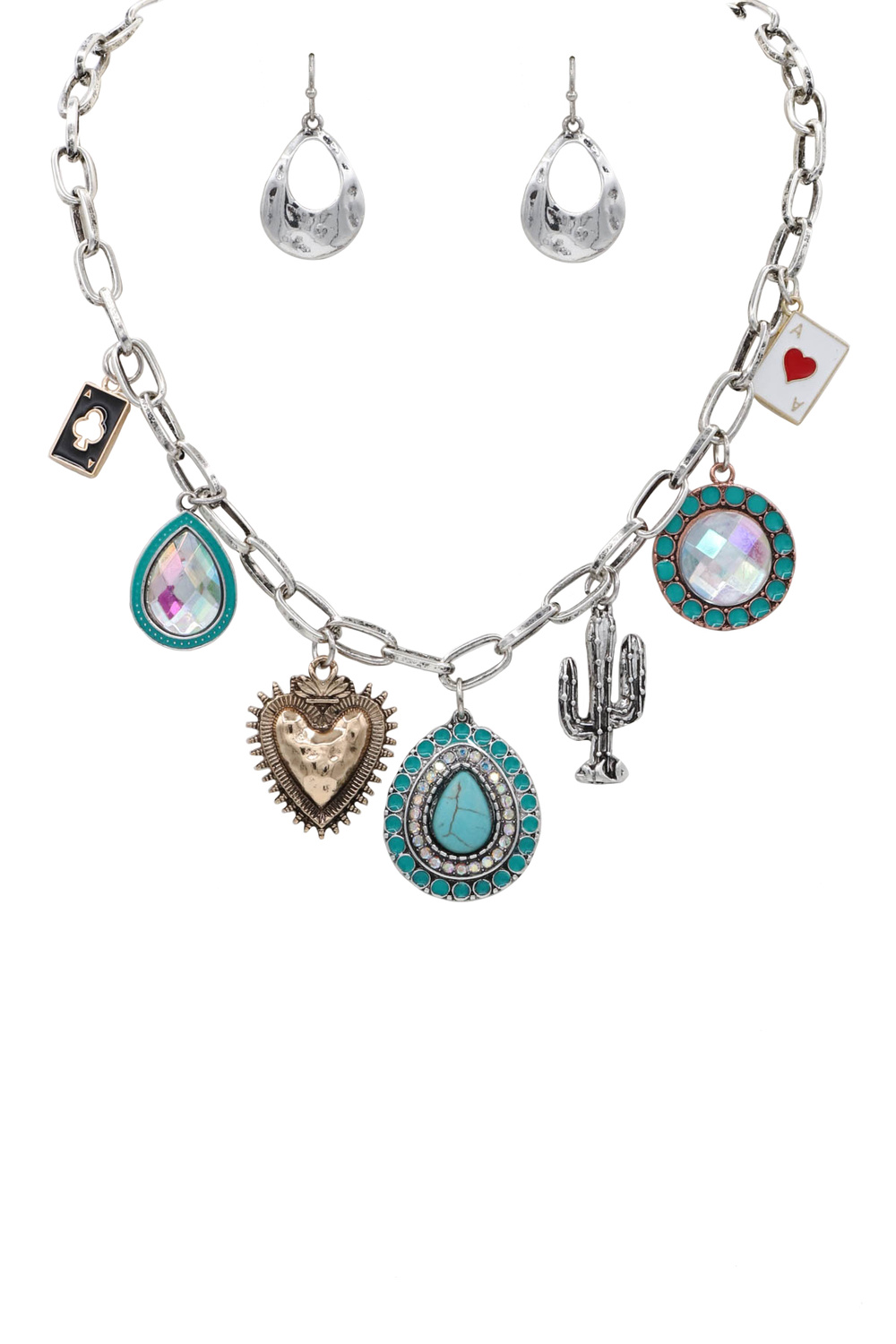- Jewelry set featuring a western-themed charm necklace with matching earrings. Lightweight and easy to style.