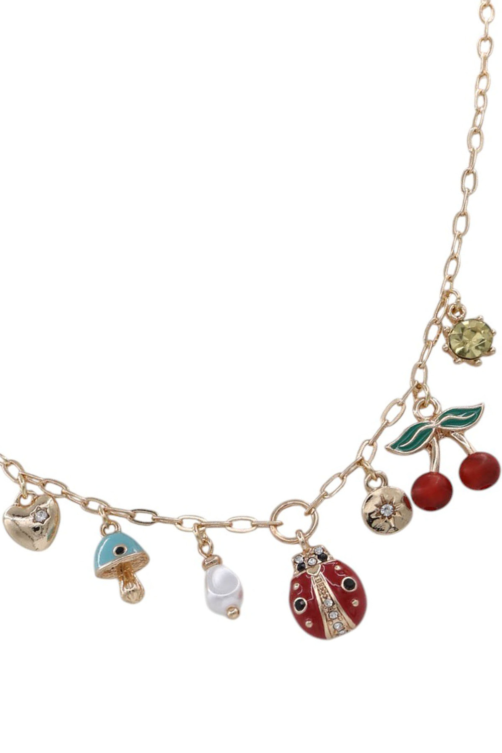 - Playful necklace featuring charming metal ladybug and cherry charms. A fun and whimsical accessory for everyday wear.