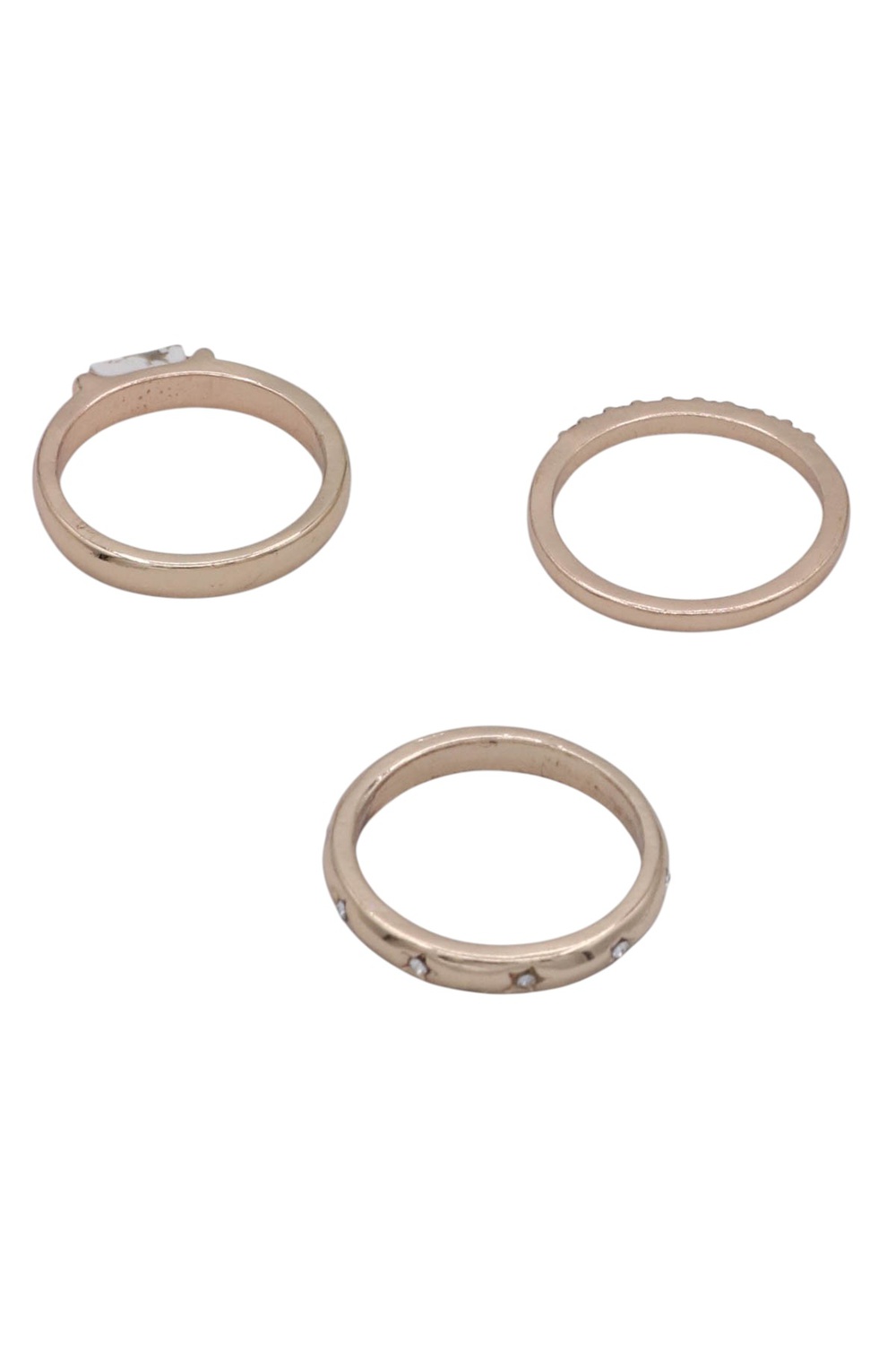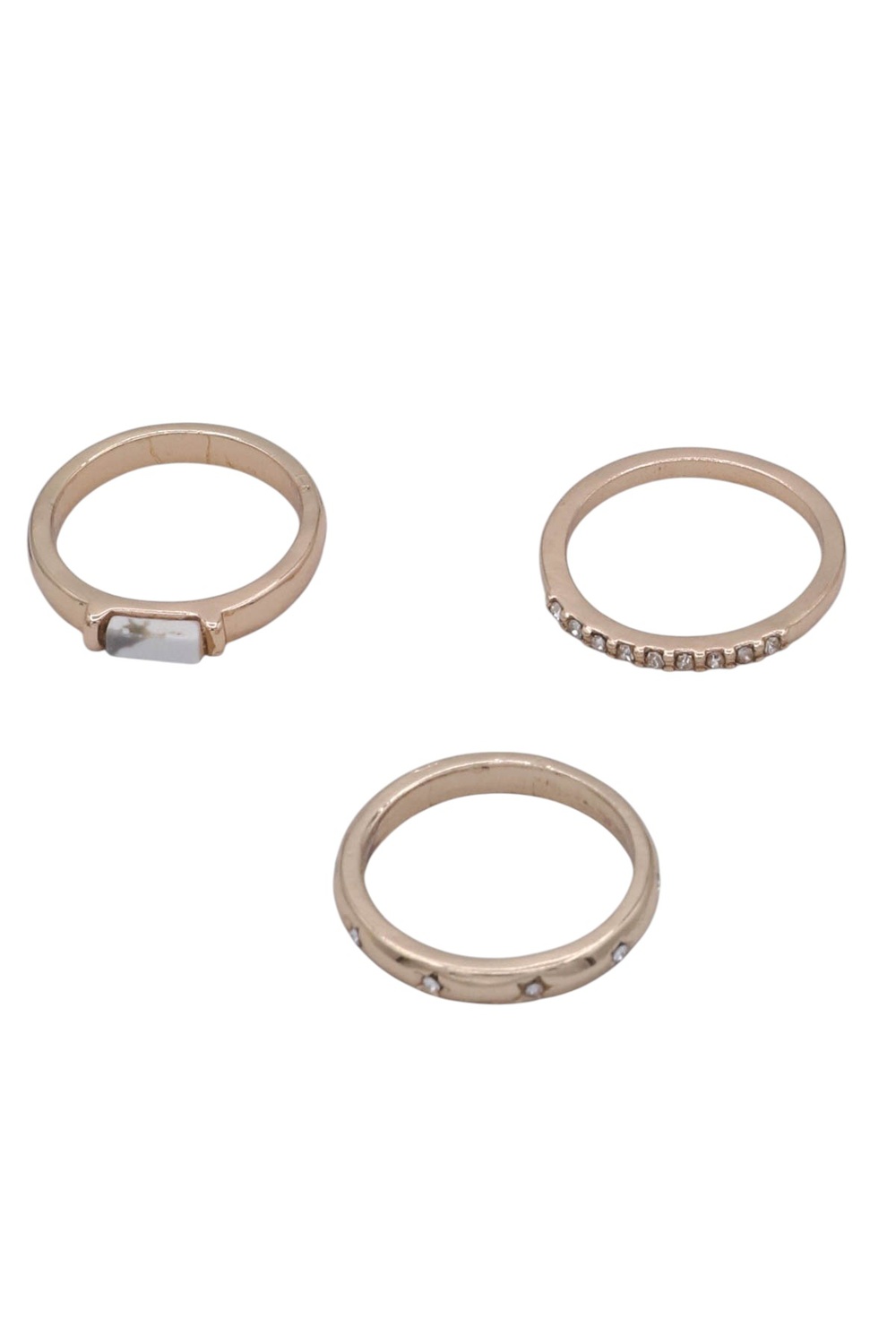 - Chic ring trio with sparkling rhinestones and semi-precious stones. Lightweight and versatile, ideal for layering or gifting.